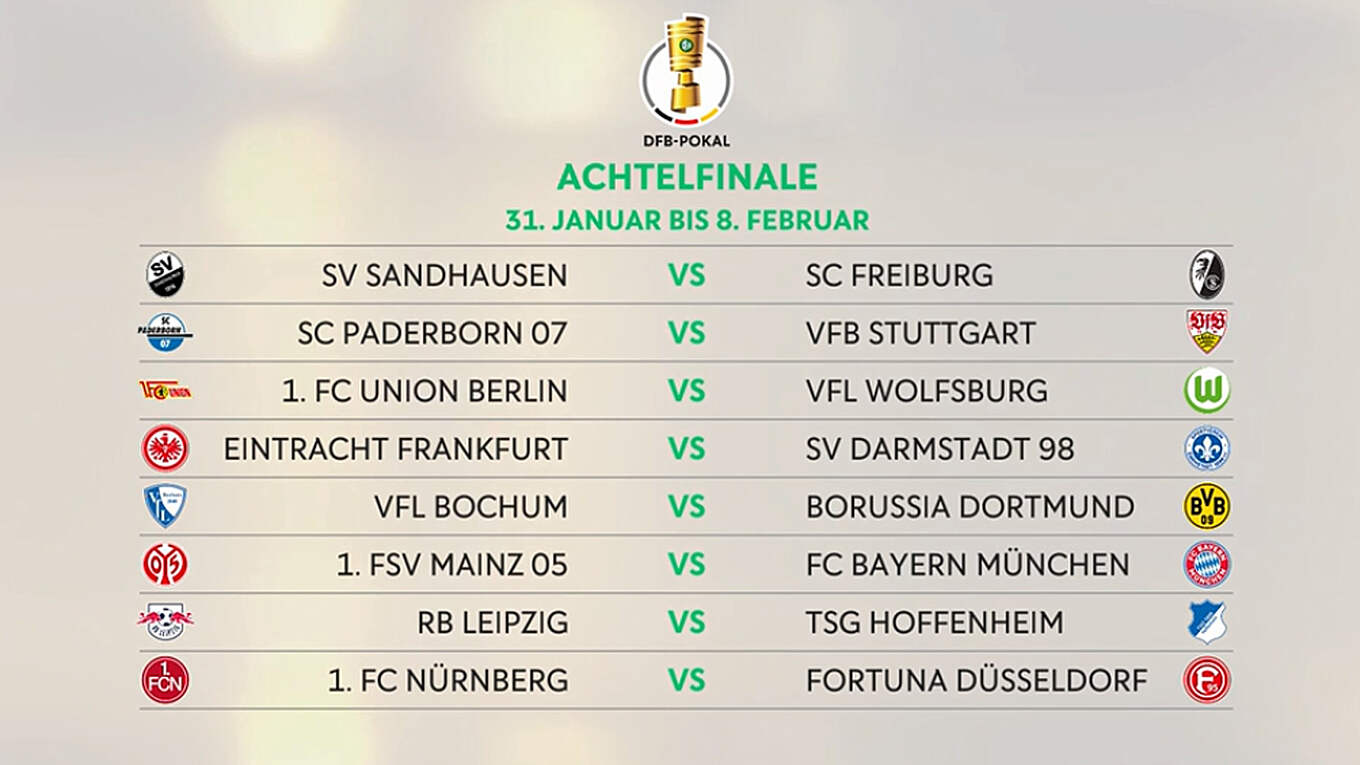 dfb pokal achtelfinale 2024 – 64 Mannschaften, 63 Spiele, ein Sieger – der DFB-Pokal ist für die deutschen Vereine der „einfachste“ Weg zu einem Titel. Für die Zuschauer vor den TV-Geräten und Livestreams ist es . Acht Zweitligisten stehen im Achtelfinale des DFB-Pokals, so viele wie seit 31 Jahren nicht mehr. Der Pokal ist ihre große Bühne – und für manchen Klub auch Ablenkung von der Tristesse in der Liga. .